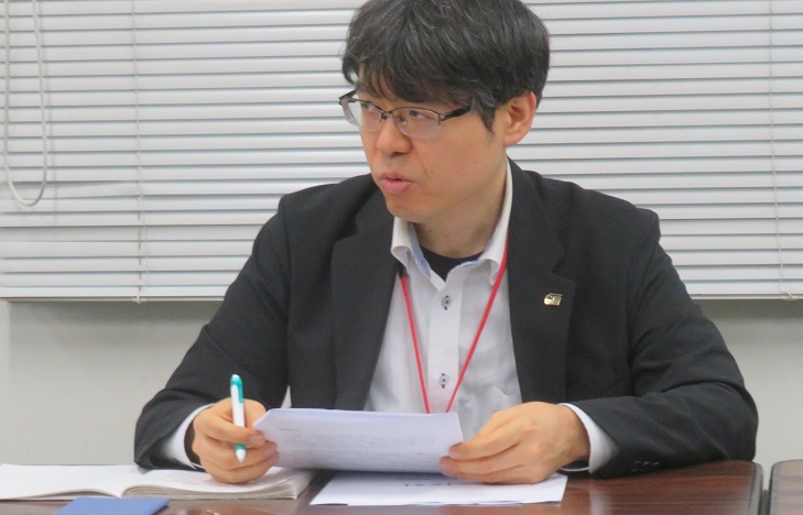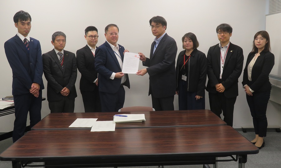 酒井参事官に要求書を手交する原川委員長(中央左)と交渉メンバー