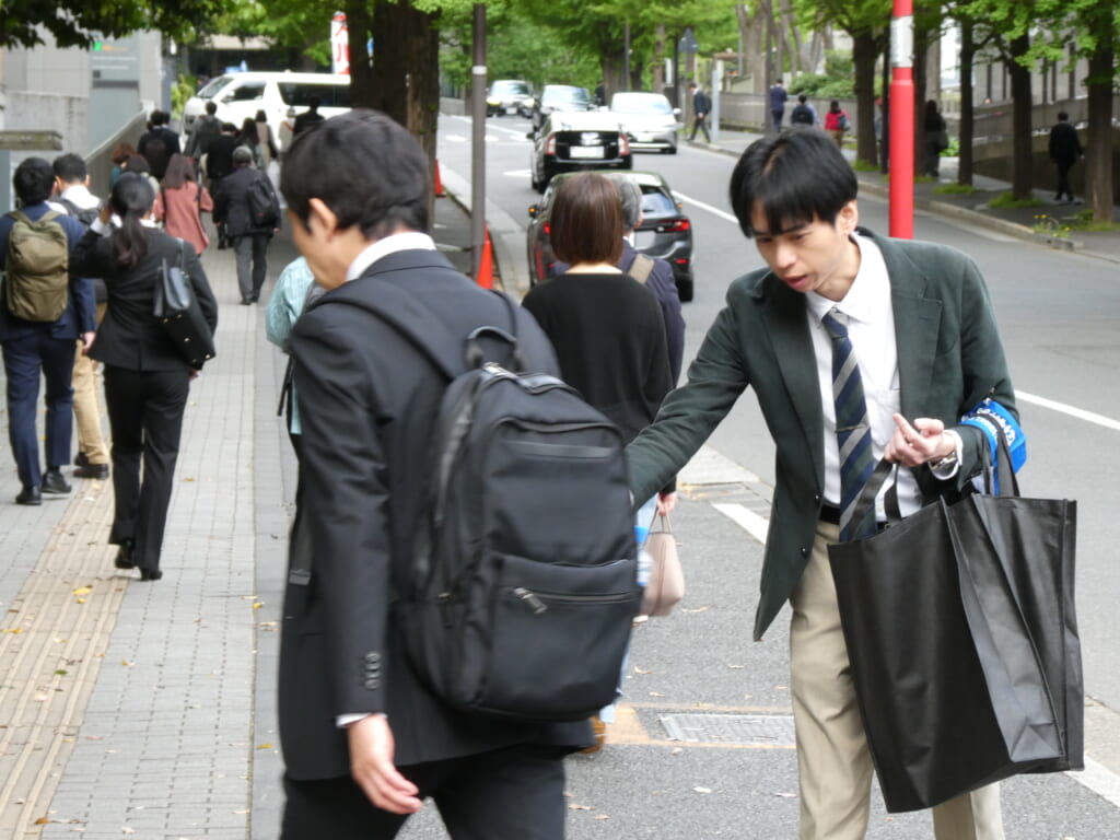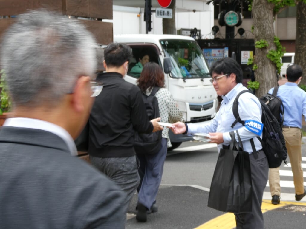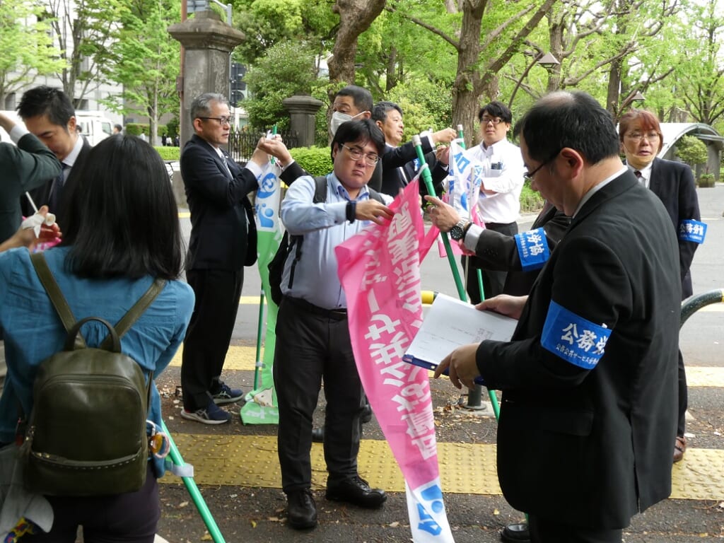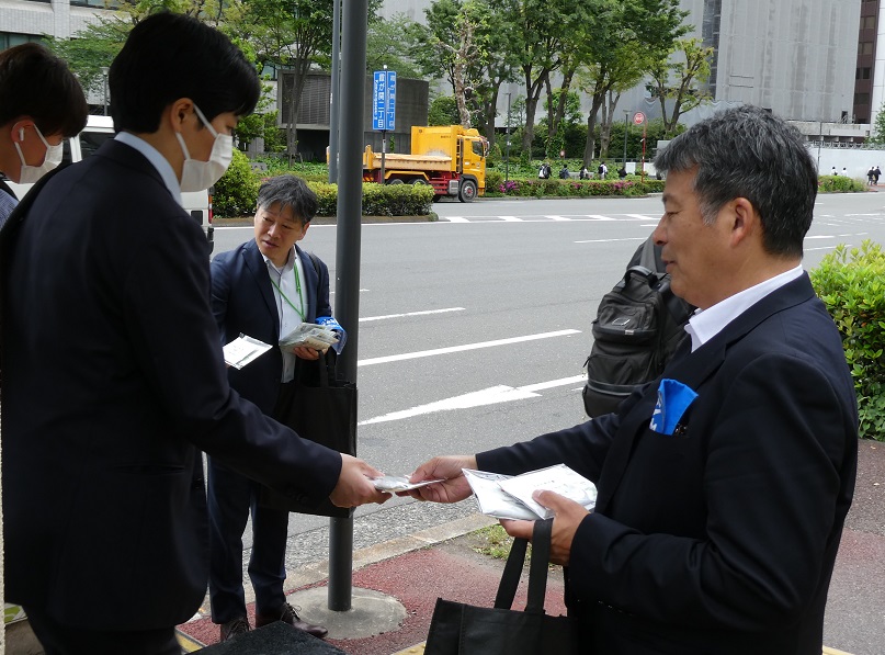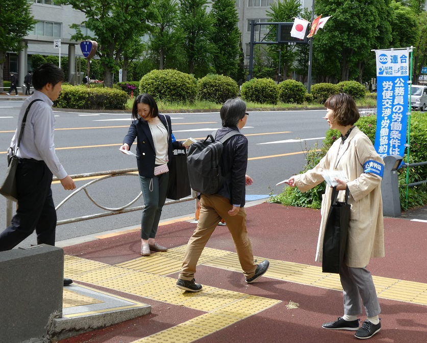 4月21日、国公連合は公務労協と共同で取り組む「組織拡大街頭宣伝行動」を霞が関・虎ノ門(官庁街)エリアにおいて実施しました。各構成組織からの参加者は、道行く人々へ「労働組合に入りましょう!」「困りごとは国公連合まで!」などの声掛けのもと、チラシ入り除菌ティッシュを配布するなどのアピールを行いました。