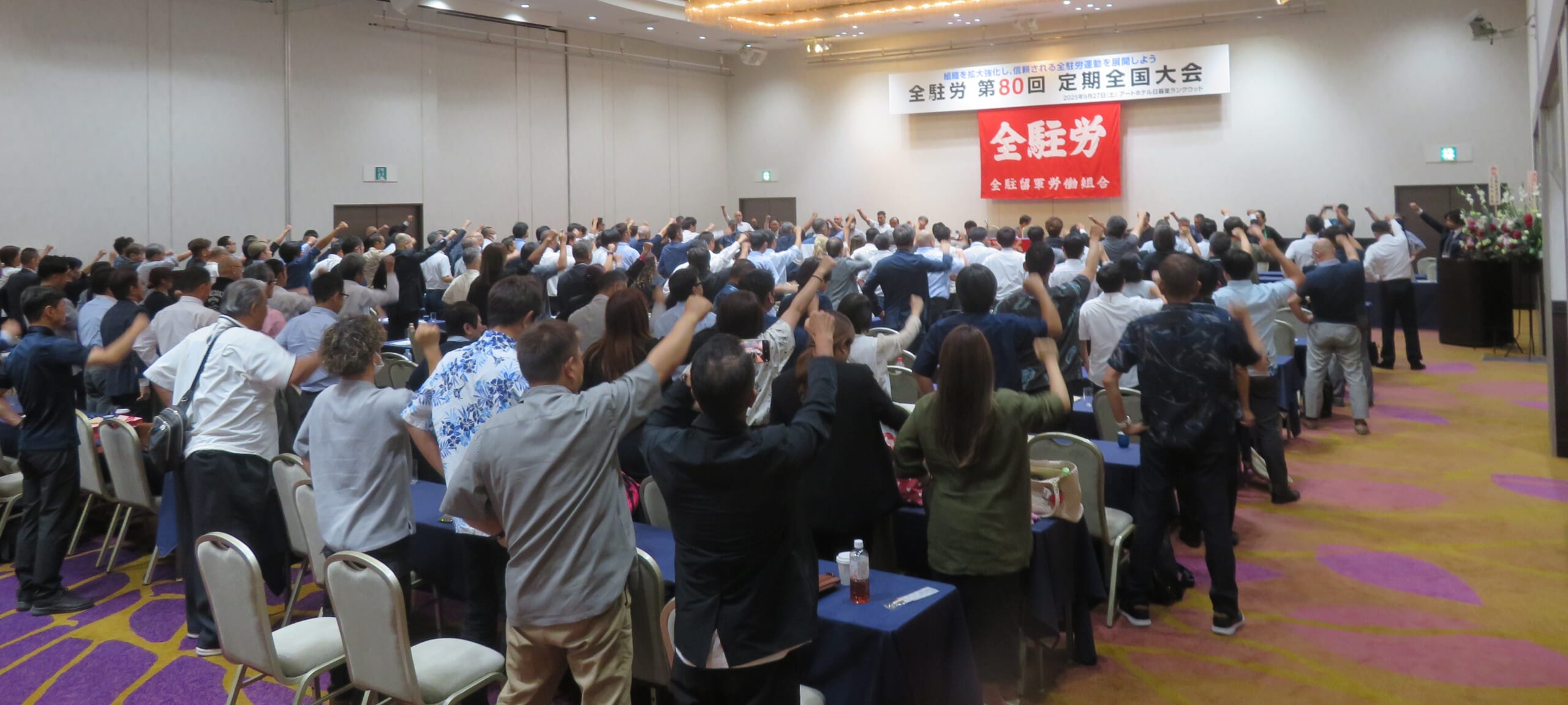 | 全駐留軍労働組合(全駐労)は、在日米軍基地で働く従業員で組織する労働組合です。北は青森から南は沖縄まで、7地区本部・5支部の約1万2千7百人で構成されています。私たちは在日米軍基地という特殊な環境下で、1300以上の多岐にわたる職種に従事し、在日米軍の後方支援を通じ日米安全保障の一翼を担うという重要な役割を果たしています。 米軍基地の職場は、米国の管理下に置かれ日本の法律が直接及ばない世界であり、雇用主は日本政府(防衛省)、使用者は米軍という、2国の狭間に置かれる複雑な環境にあります。組合と防衛省が合意しても、米軍の合意がなければ従業員の賃金・労働条件の改善など、国内法令でさえ適用されないというような深刻な問題も発生しています。 このような特殊な環境下において、雇用・離職者対策、特別協定延長、日米地位協定の見直しなどの政治課題も山積しておりますが、懸命に業務に邁進する従業員一人ひとりの生活を守り、労働条件や職場環境を改善することを第一義に、米軍、防衛省に対し諸課題の解決に向け常時交渉を積み上げています。 |